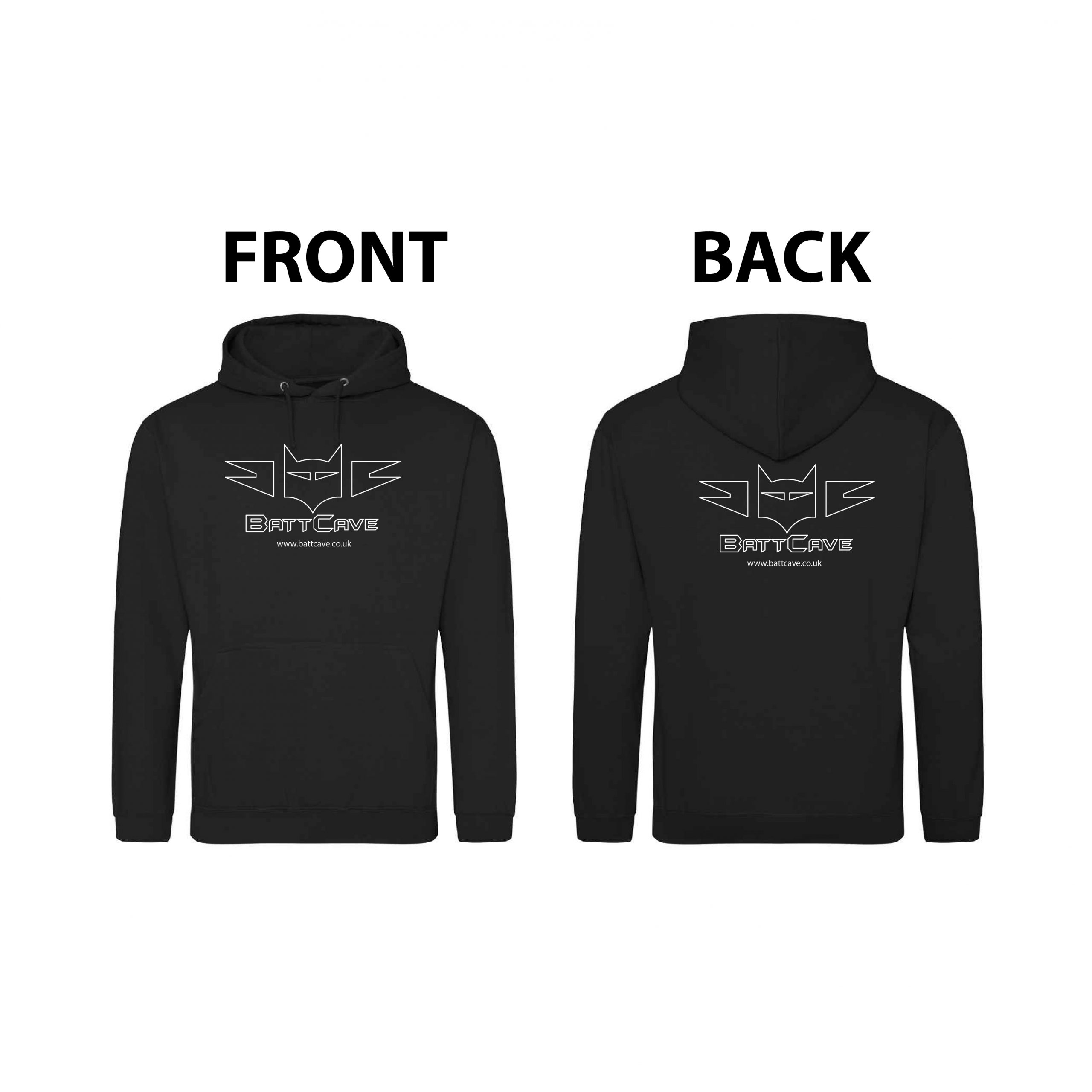 This great quality comfortable black adult hoodie has a large BattCave logo printed on the chest and a large BattCave logo printed on the back. The logo is printed in white.