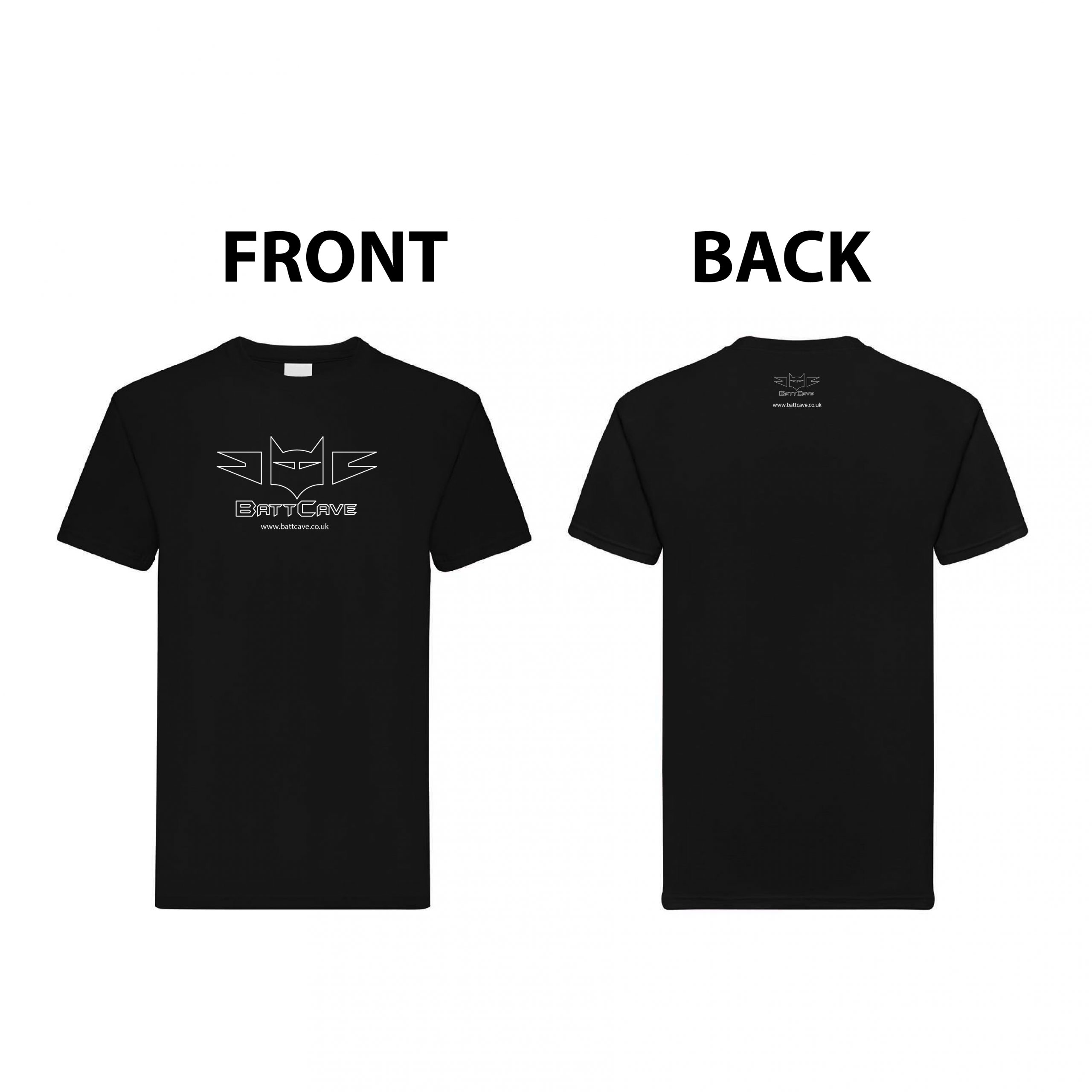 This great quality comfortable black adult t-shirt has a large BattCave logo printed on the chest and a small BattCave logo printed on the back. The logo is printed in white.