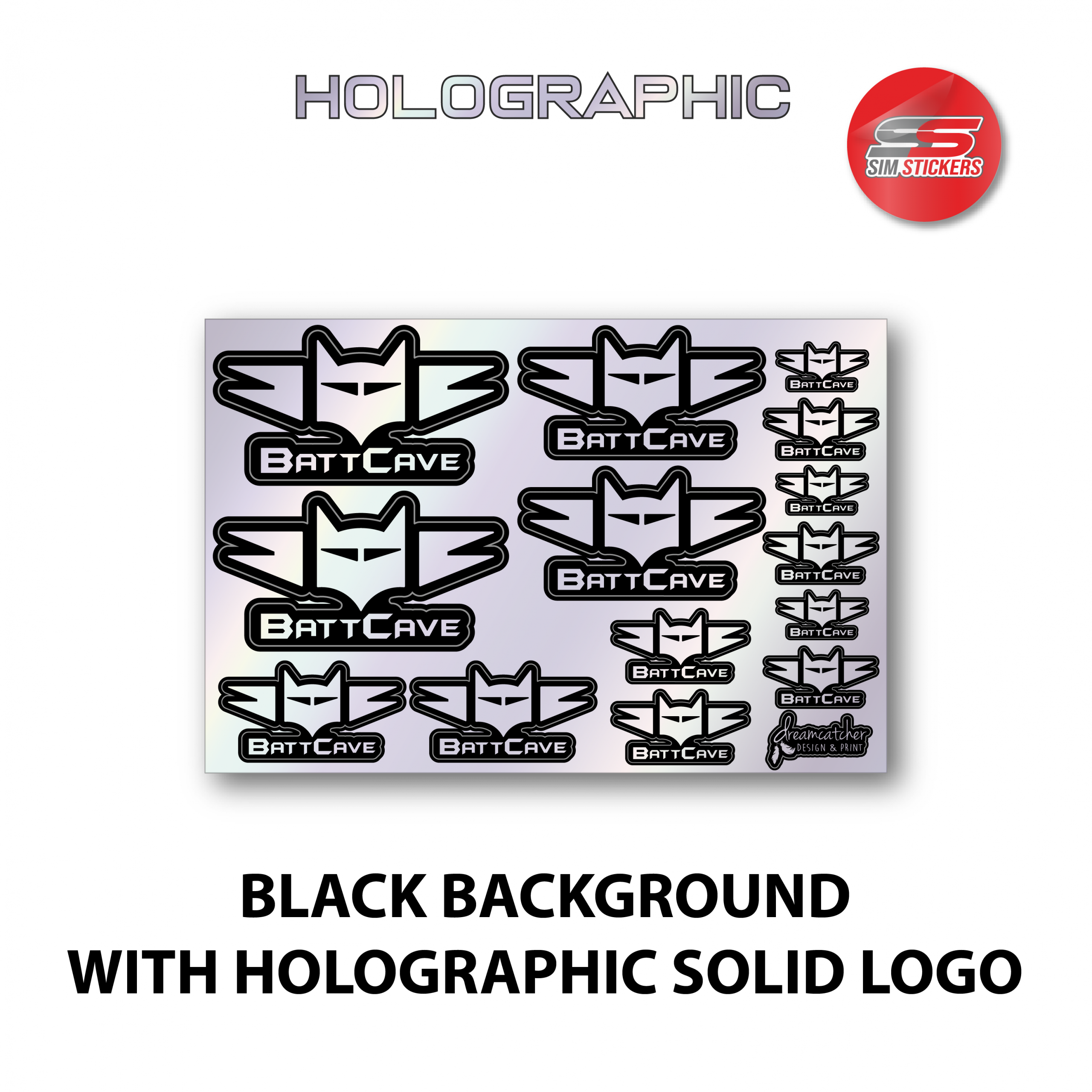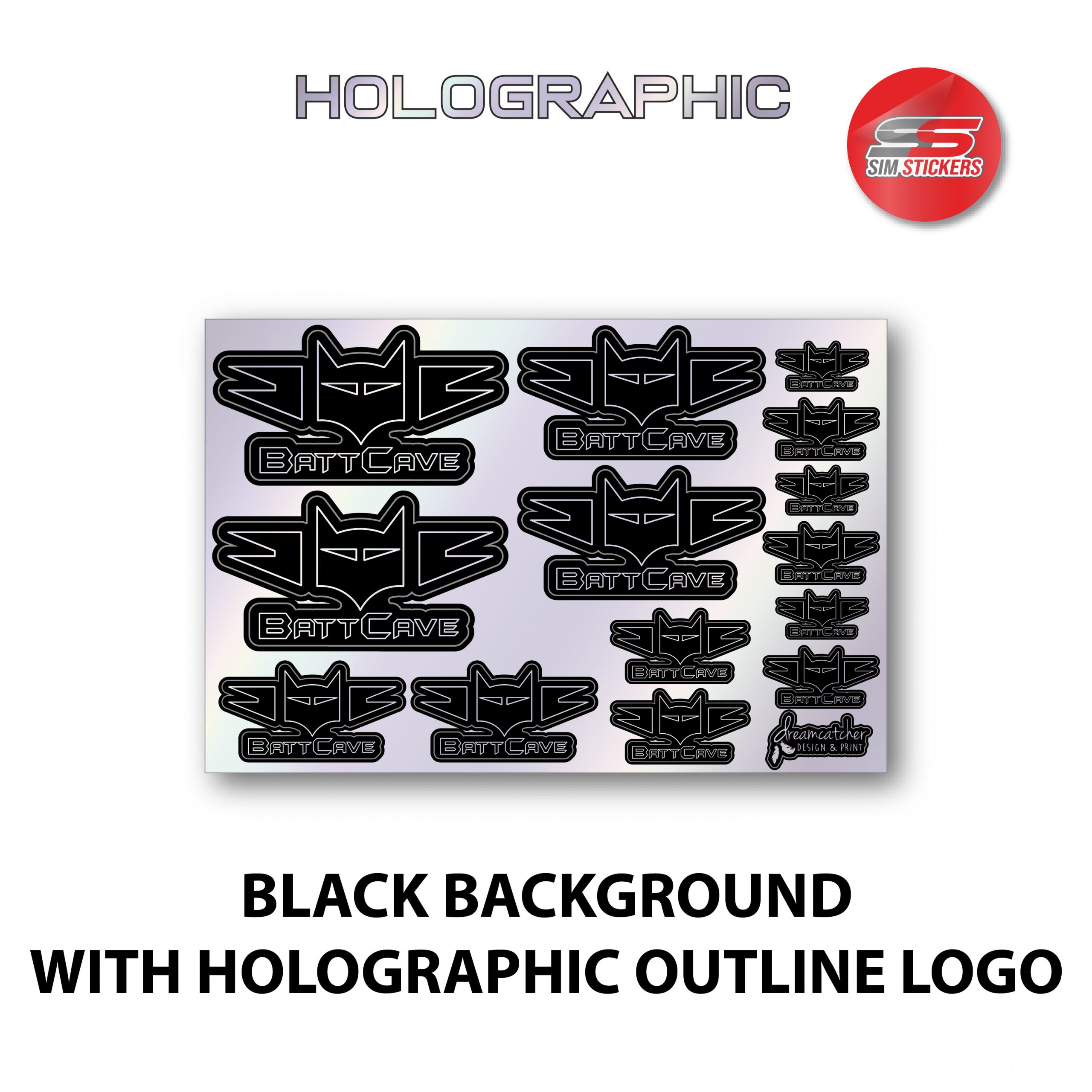 This sticker sheet has the BattCave logo in various sizes and comes in 3 different colour options: holographic background and black outline logo, black background and holographic solid logo, or black background and holographic outline logo. This sticker sheet is 145mm wide x 97mm high. These stickers are made in partnership with Sim Stickers.