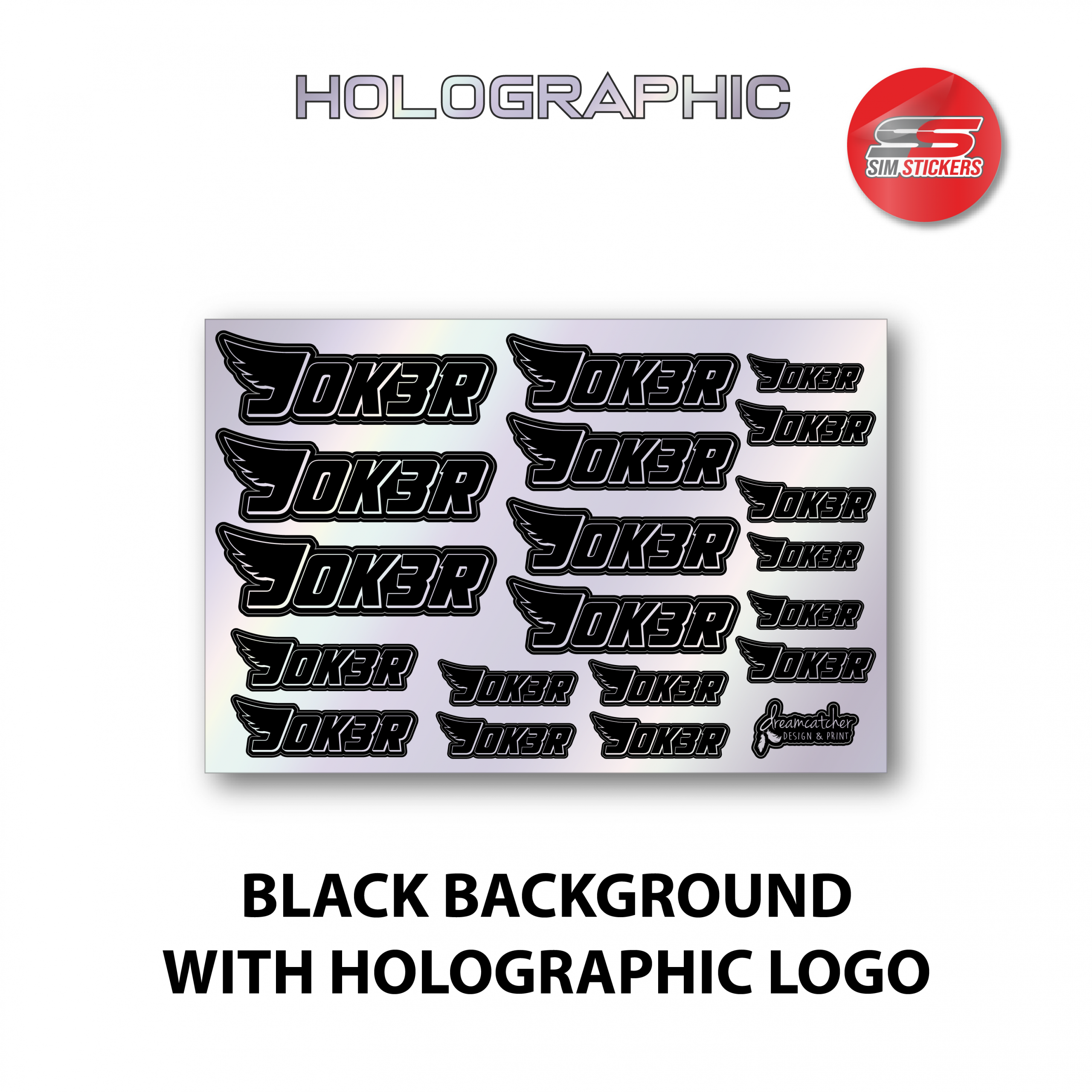 This sticker sheet has the JOK3R logo in various sizes and comes in 2 different colour options: holographic background and black logo, or black background and holographic logo. This sticker sheet is 145mm wide x 97mm high. These stickers are made in partnership with Sim Stickers.