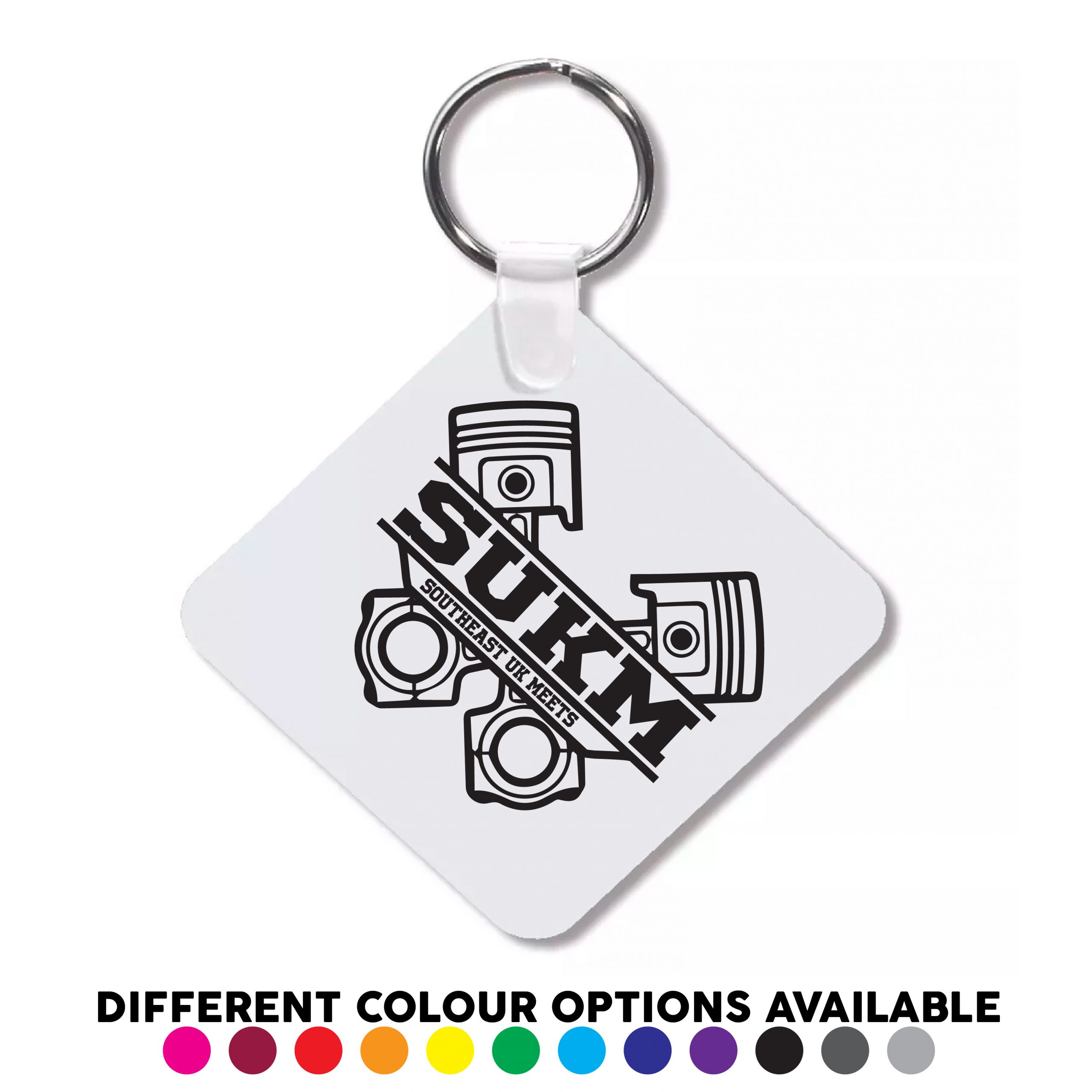 This acrylic keyring has the SUKM logo printed on the front and back in the colour of your choice. Colour options include pink, burgundy, red, orange, yellow, green, light blue, dark blue, purple, black, dark grey and light grey.