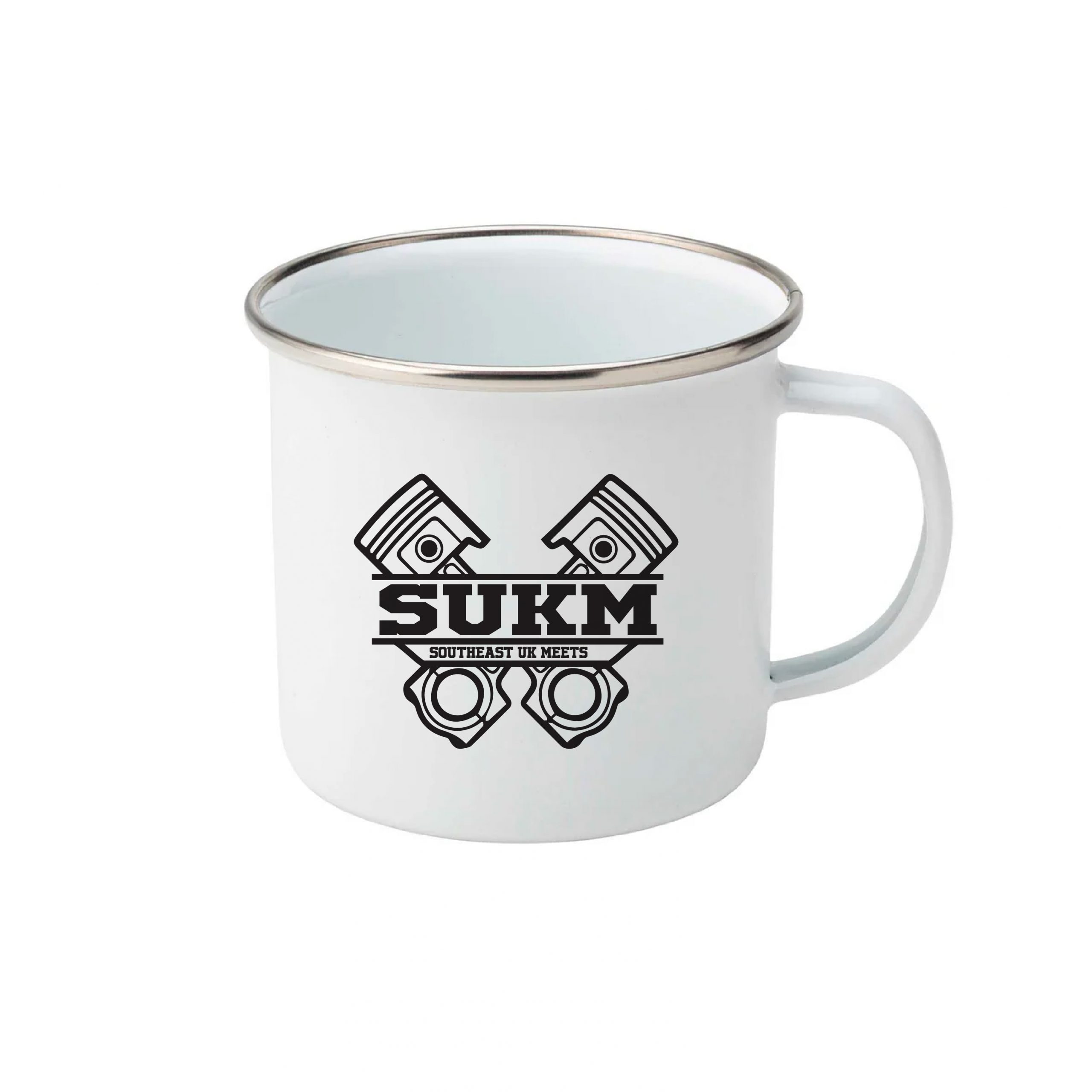 This white metal mug has the SUKM logo printed on the front and back in the colour of your choice. Colour options include pink, burgundy, red, orange, yellow, green, light blue, dark blue, purple, black, dark grey and light grey.