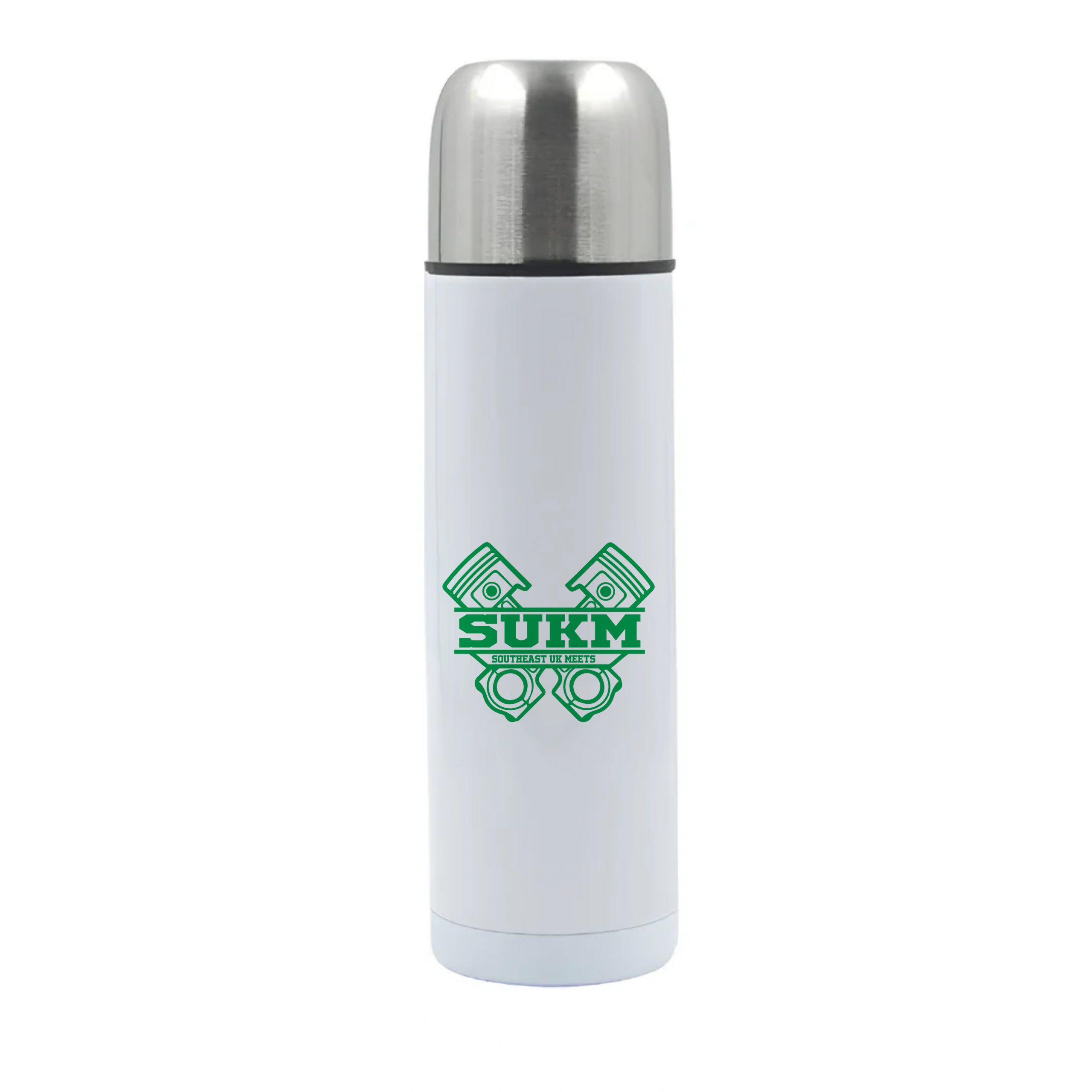 This flask has the SUKM logo printed on the front and back in the colour of your choice. This white thermal flask has a silver cup lid and a 500ml capacity. Colour options include pink, burgundy, red, orange, yellow, green, light blue, dark blue, purple, black, dark grey and light grey.